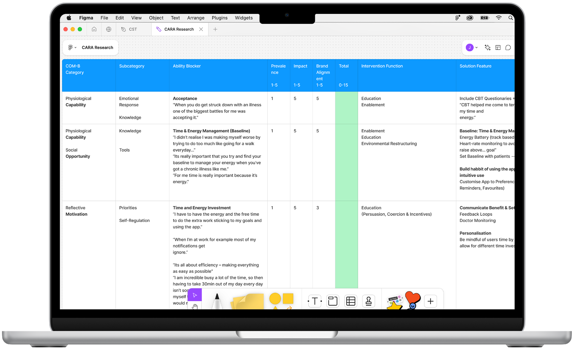 Cara’s design is rooted in behavioural science and created in collaboration with psychologists and physicians. Behavioural audits enabled us to balance users’ self-accountability with extrinsic guidance address ability blockers and identify intervention opportunities. Insights highlighted the power of personalisation and tapping into users’ intrinsic motivation to foster long-term behavioural change. The behavioural research informed nuanced feedback loops CST-based gradual goal-setting progress tracking and tailored nudges to support the patients’ journey while remaining feasible for healthcare providers.
